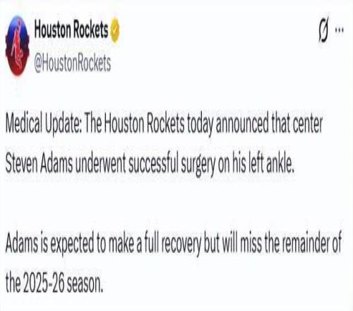 北京时间1月29日,据ESPN记者Shams报道,火箭队中锋史蒂文-亚当斯因左脚踝伤势接受手术,将缺席2025-26赛季剩余全部比赛。随后,火箭官方宣布了这一消息。亚当斯本人晒出术后病床照:一切都很顺利,感谢你们所有的关心和祈祷。