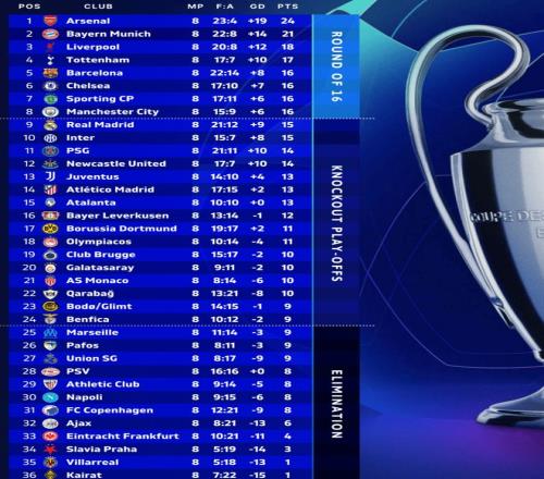 而皇马输给本菲卡后跌至第9,将参加附加赛。同样参加附加赛的还有国米和卫冕冠军巴黎圣日耳曼。